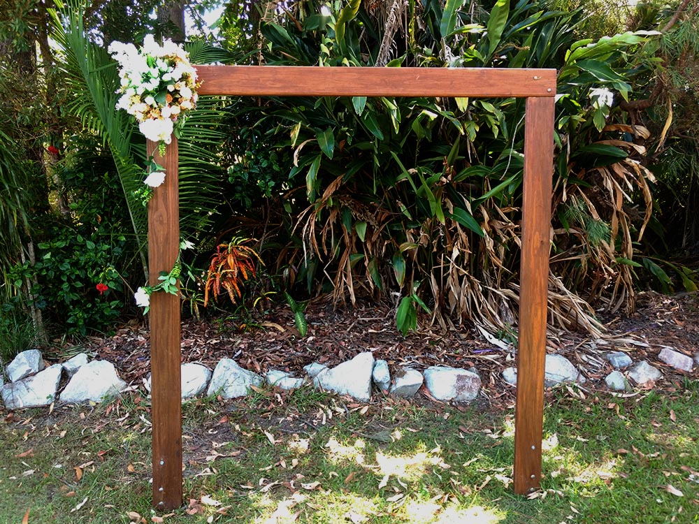 Arbor 12 - below a rustic wild wood arbor for beach and bush comes with artificial flower set and optional drape, optional real flower set as extra