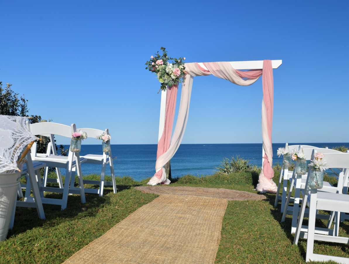 a beautiful white wood wedding package for hire with optional draped cloth and or faux flowers.